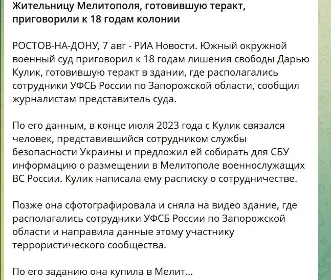 20-річну мешканку окупованого Мелітополя Дар'ю Кулик Південний окружний військовий суд у Ростові-на-Дону засудив до 18 років колонії загального режиму та штрафу в 600 тисяч рублів.