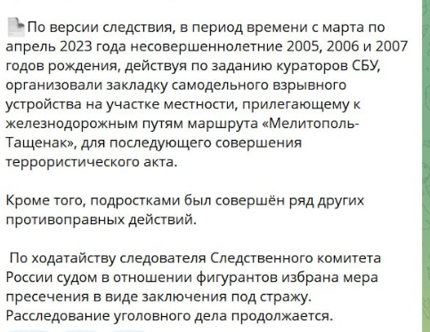 У грудні 2023 року підконтрольні Росії Telegram-канали поширили повідомлення про затримання трьох підлітків з Мелітополя.