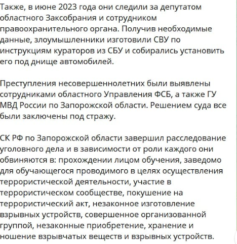 Також окупанти звинувачують підлітків у тому, що в червні 2023 року вони нібито стежили за депутатом обласної Законодавчої ради та співробітником правоохоронних органів, збирали дані і планували встановити СВУ під днищем автомобілів.