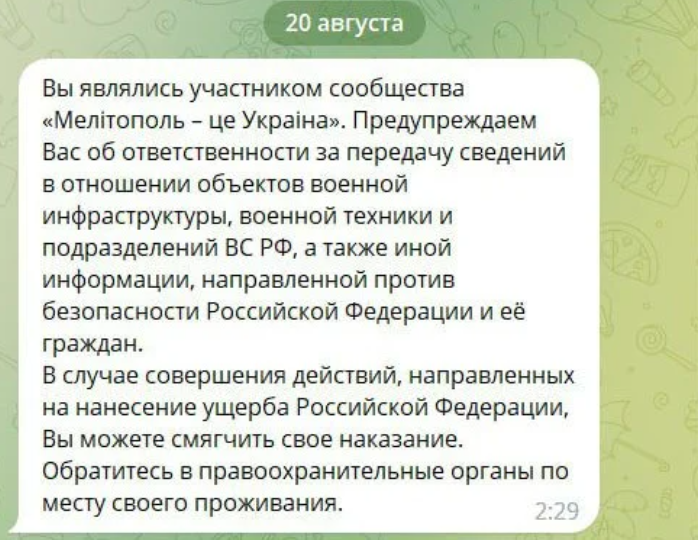 «Наприкінці серпня 2023 року я був у відпустці. Увечері намагався зайти в чат — телеграм мене просто викинув. Написав знайомим мелітопольцям у різних містах України: «У вас так само?» — Вони відповіли: «Ні, все працює». Через 10–20 секунд їх теж викинуло. Потім прийшло повідомлення з адмін-аккаунта: «Чат належить Росії, будь-які дії каратимуться законами РФ», — розповідає Олександр.