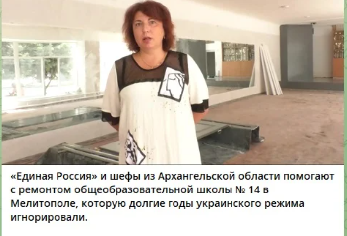 На камери окупаційних ЗМІ Службіна охоче розповідає про «руйнування за України» і необхідність рятувати шкільні будівлі — стандартний набір тез російської пропаганди.