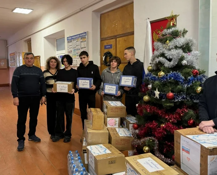 Службіна Інна (друга праворуч) і так званий мер окупованого Мелітополя Сергій Золотарьов (крайній ліворуч) змушують учнів збирати гуманітарну допомогу для російських військових