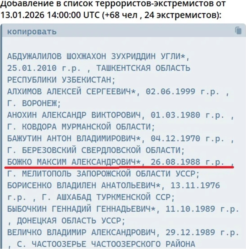 До списку також внесено Максима Божко, уродженця Мелітополя, захисника «Азовсталі», який перебуває в російському полоні. Формально Росія включає його до переліку «терористів», однак насправді йдеться про військовополоненого, який захищав Маріуполь у складі українських сил оборони.