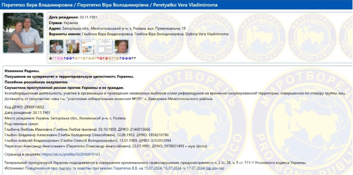 До слова, дівоче прізвище Віри — Глибина, що, ймовірно, свідчить про її родинні зв’язки з сімейством колаборантів з Якимівки. Ми писали, що глава родини Олександр пішов на службу до окупаційної поліції та разом із дружиною виховує дочок у дусі російської пропаганди.