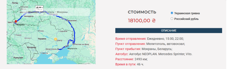 Найбільшою популярністю користується маріупольсько-новоазовський напрямок. Наприклад, ним можна доїхати з окупованого Мелітополя до КПП «Мокрани», Білорусь. Шлях неблизький – майже 2500 км через ТОТ, що займе 46 годин часу. Обійдеться така подорож від 18100,00 грн. Щодо маршруту, то він пролягає через Маріуполь.