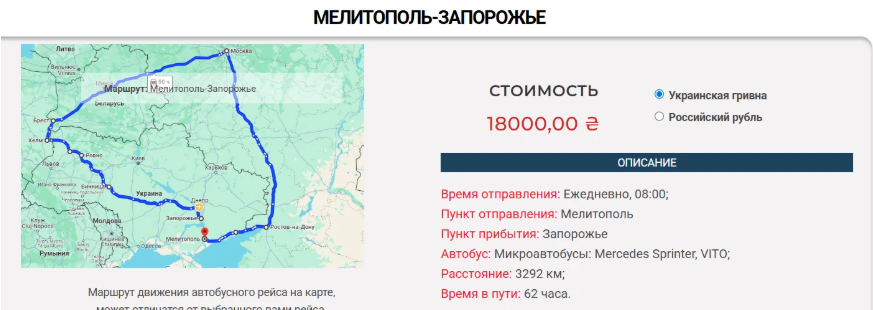 Існує маршрут Мелітополь – Запоріжжя. Коштуватиме він від 18 000 грн. У дорозі належить провести 62 години. Їхати також через Маріуполь, РФ, Білорусь.