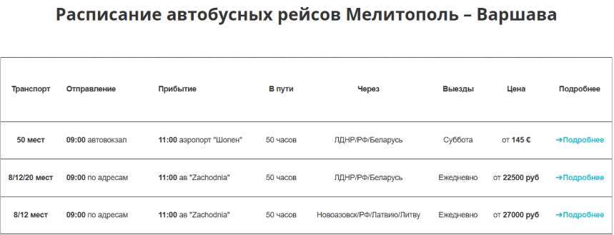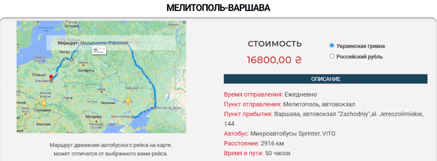Є можливість виїхати з окупованого Мелітополя до Європи. Наприклад, популярний маршрут Мелітополь – Варшава. Шлях так само через Маріуполь, через Ростов, Москву. У дорозі належить провести 50 годин, а обійдеться це в 16 800, 00 грн.