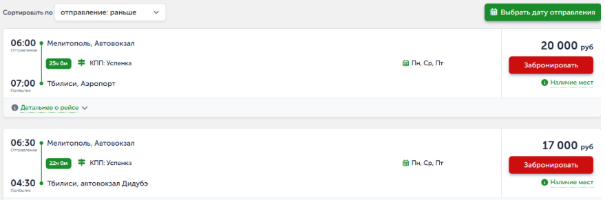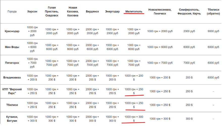 Є ще одна пропозиція від перевізника. Маршрут: Мелітополь – Сімферополь – Керч – Краснодар – П'ятигорськ – Владикавказ – Тбілісі – Кутаїсі – Батумі. Вартість 250-300 доларів плюс 1000 грн.
