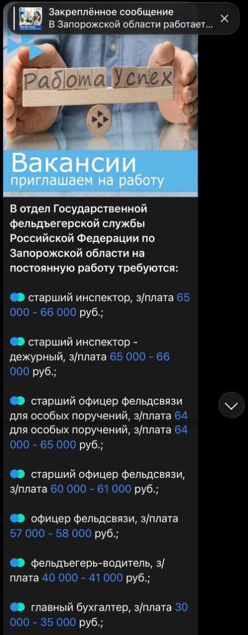 Скріншот з ТГ-каналу окупаційного Центра зайнятості