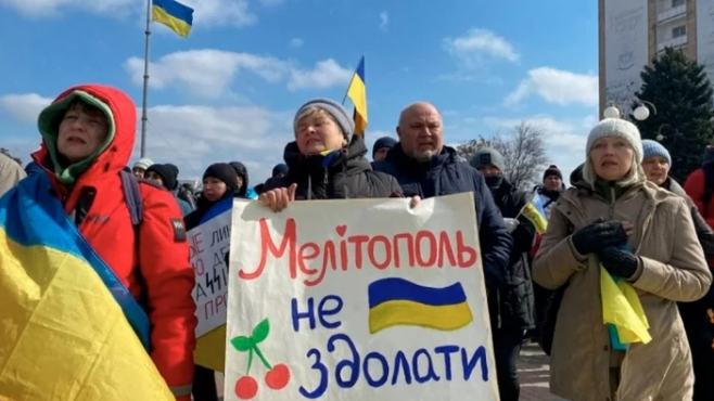 Проукраїнські протестні акції "Мелітополь - це Україна", 2022 рік. Люди демонтрують плакат "Мелітополь не здолати" з зображення черешні та українського прапору. Фото з відкритих джерел