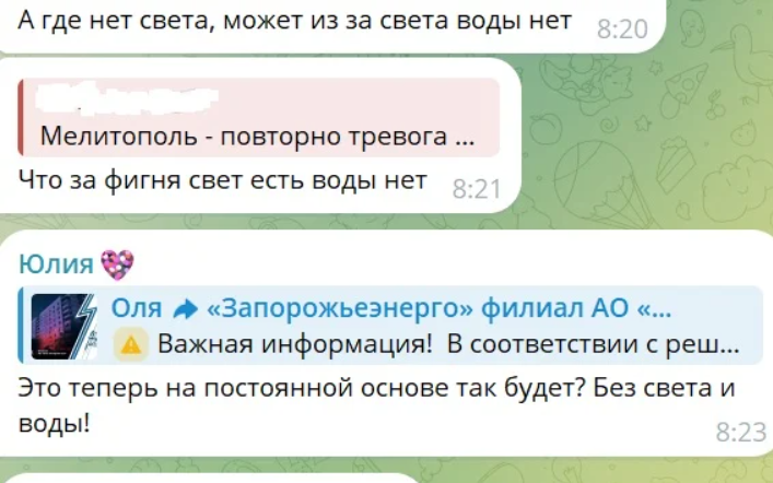 Світло відсутнє в нижній частині міста, на Новому Мелітополі, Юрівці, в авіамістечку, а також у низці інших населених пунктів регіону. За словами жителів, усе почалося з різких перепадів напруги: побутова техніка працювала зі збоями або зовсім вимикалася.