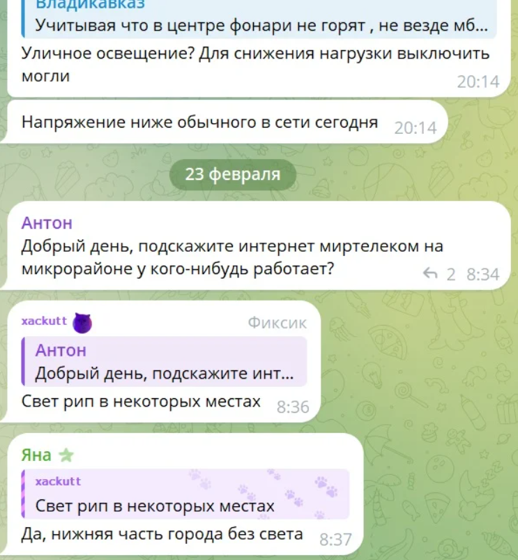 Потім електропостачання зникло повністю. На мікрорайоні за наявності світла відсутня вода. Інтернет також працює з перебоями або не працює зовсім.