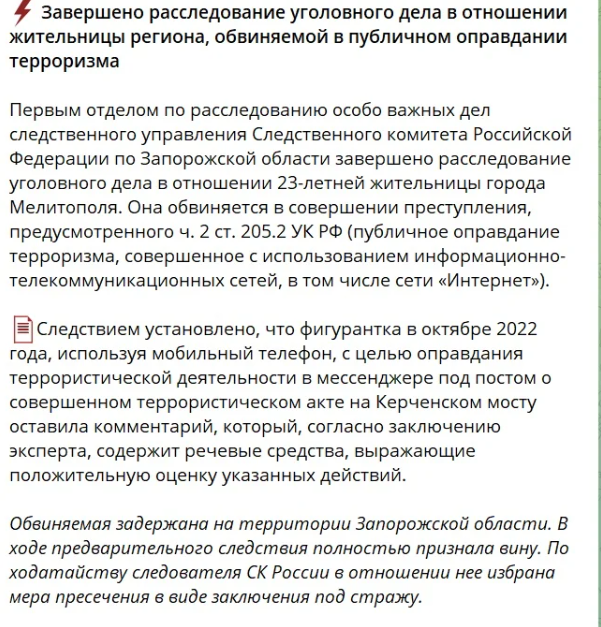 Слідчий комітет РФ відзвітував про завершення розслідування справи за статтею про «публічне виправдання тероризму» (ч. 2 ст. 205.2 КК РФ).
