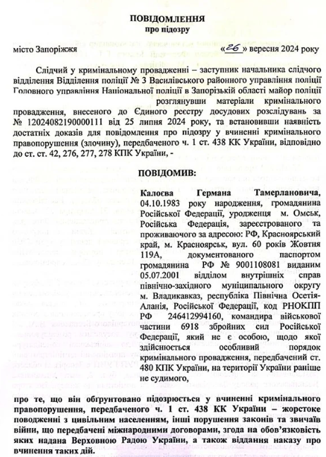 Хортицький районний суд Запоріжжя заочно засудив підполковника Росгвардії Германа Калоєва до 11 років позбавлення волі. Той, кого в РФ називають «героєм», на окупованій Мелітопольщині запам'ятався як садист, мародер і кат, надзвичайної жорстокості якого боялися навіть російські вояки.