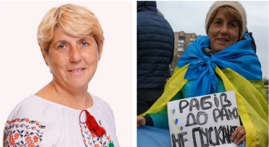 Педагогиня Ганна Бут. Справа: Ганна на мирній протестній акції на початку окупації Мелітополя. Фото з відкритих джерел