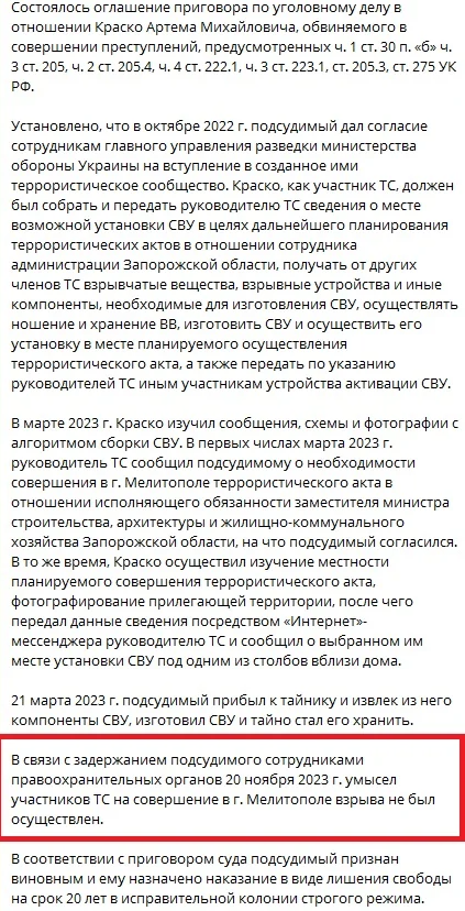 Навіть з офіційної версії випливає: жодного теракту в підсумку не сталося. Сам суд прямо вказує, що «умисел не був реалізований» через затримання Краско у листопаді 2023 року.