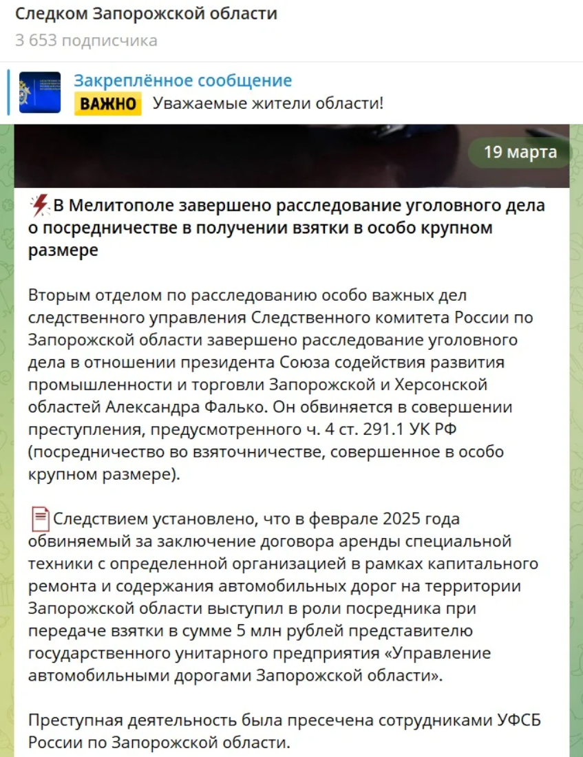 В окупованому Мелітополі завершилося розслідування гучної корупційної справи стосовно Олександра Фалька — місцевого «рішали», ексдепутата від «Партії регіонів» та президента кишенькового «Союзу сприяння розвитку промисловості». Колаборанта, який мітив у «князьки» Запорізької області, готують до суду за багатомільйонні відкати на дорожніх схемах.