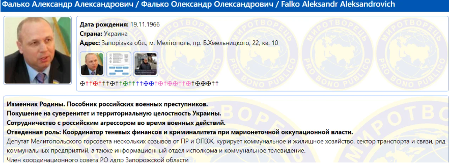 Олександр Фалько — колаборант із багатим бекграундом. До 2022 року він роками засідав у міськраді від «Партії регіонів» та «Опоблоку». З приходом окупантів він одним із перших запропонував свої послуги, ставши сполучною ланкою між бізнесом і криміналом під дахом загарбників. За даними джерел «РІА-Південь», апетити Фалька були безмежні: