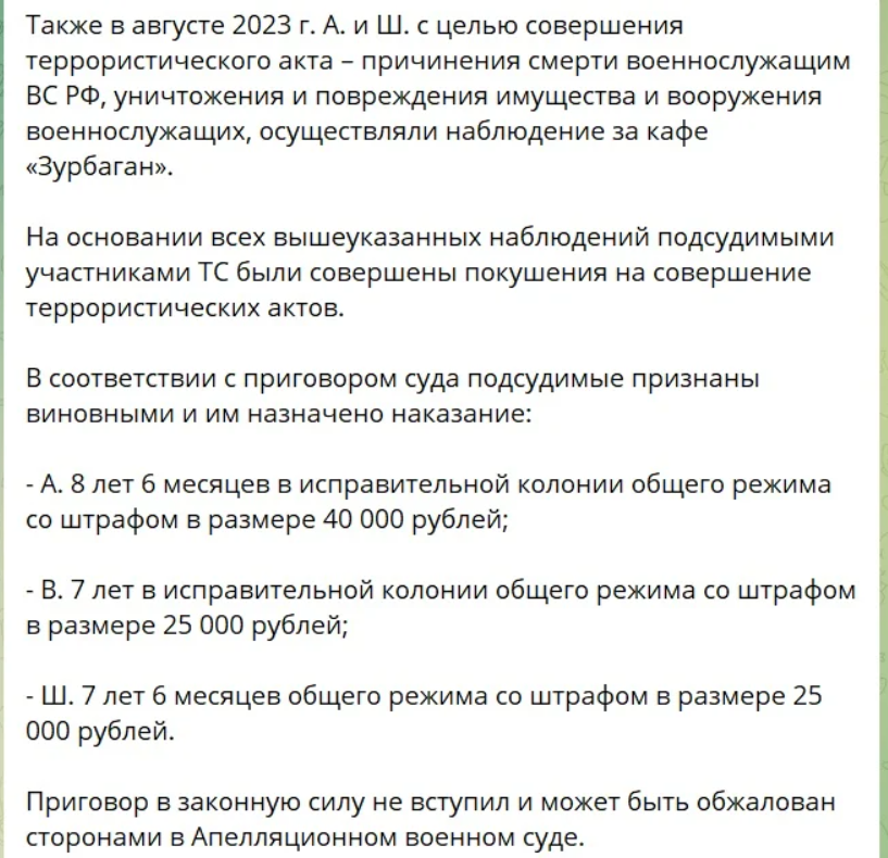 «Також у серпні 2023 р. А. та Ш. з метою вчинення терористичного акту — заподіяння смерті військовослужбовцям ЗС РФ, знищення та пошкодження майна та озброєння військовослужбовців, здійснювали спостереження за кафе "Зурбаган". На підставі всіх вищезазначених спостережень підсудними учасниками ТЗ були вчинені замахи на вчинення терористичних актів», — пишуть окупанти у вироку суду.