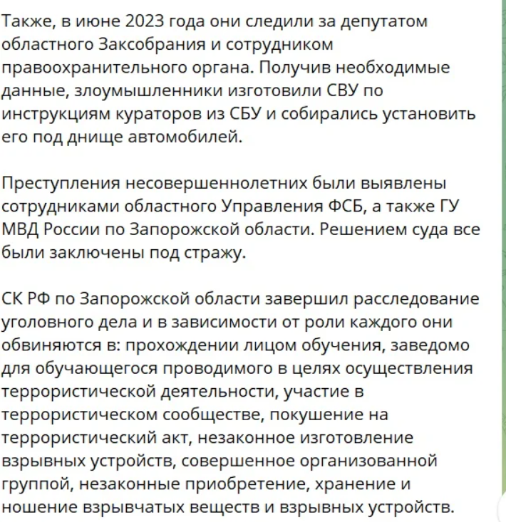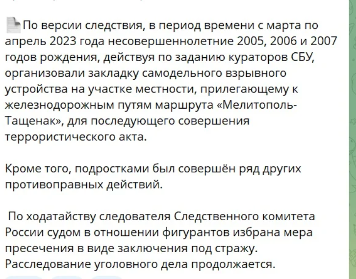 У грудні 2023 року підконтрольні Росії Telegram-канали поширили повідомлення про затримання трьох підлітків із Мелітополя.