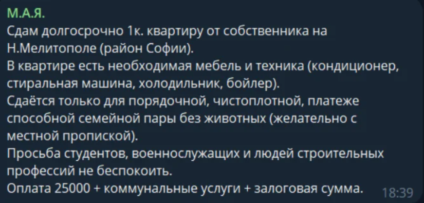 «Мелитополь сейчас столица Запорожской области, и каждый стремится с этого сделать себе деньги. Торгашня ломит цены на рынках, люди с избытком жилплощади делают деньги на этом. Не переживайте, снимайте то, что есть, в дальнейшем цены будут ещё выше. А почему так, потому что много людей понаехало с деньгами с других регионов, а наши барыги на этом делают бизнес»