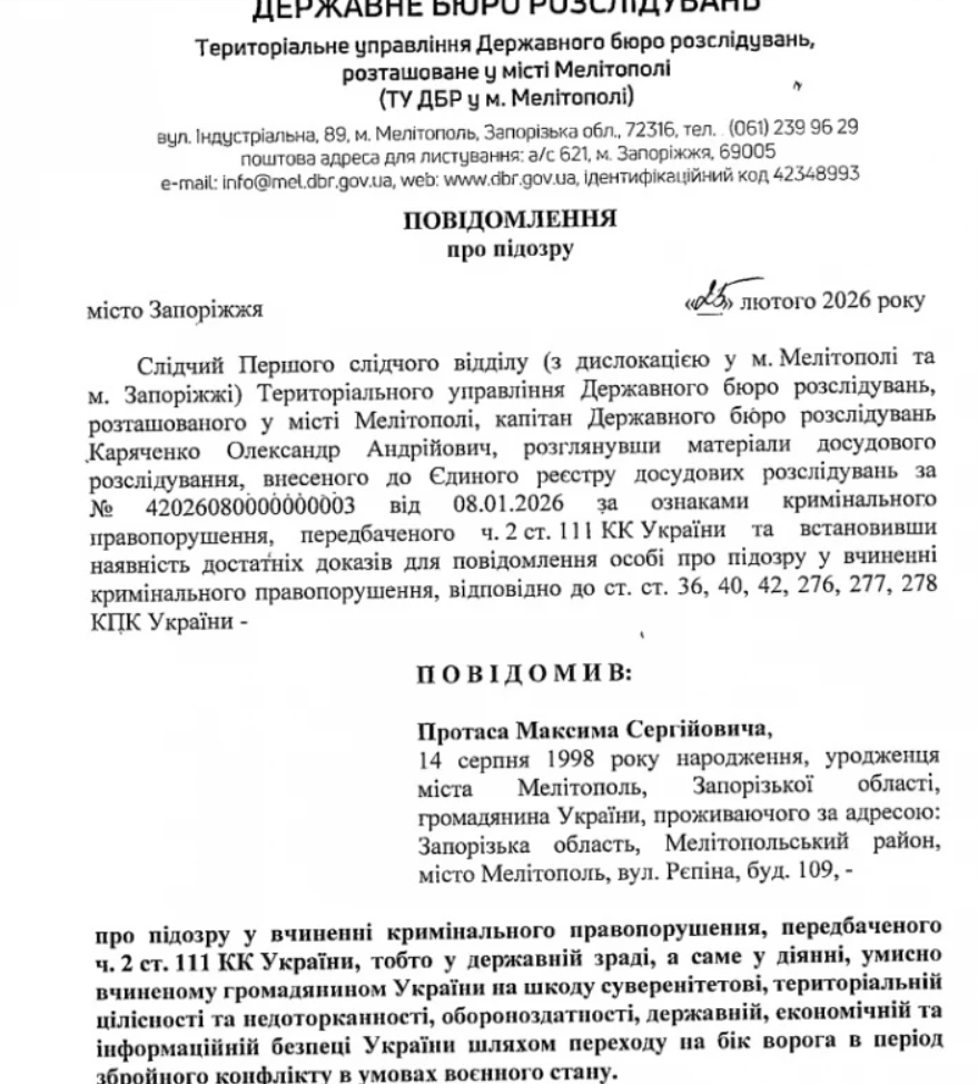 25-річному мелітопольцю Протасу повідомили про підозру за найтяжчою статтею — державна зрада, вчинена в умовах воєнного стану (ч. 2 ст. 111 КК України).