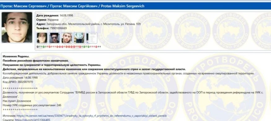 Максим Протас на сайті "Миротворець" скріншот зі сторінки
