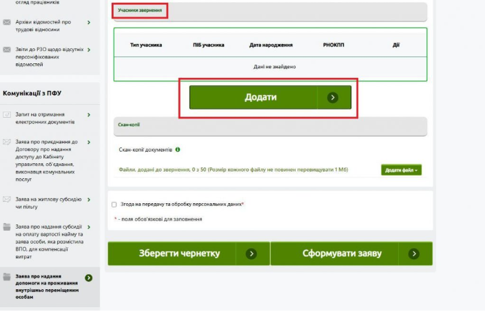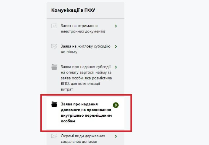 У особистому кабінеті знайдіть меню ліворуч. У розділі «Комунікації з ПФУ» виберіть пункт «Заява про надання допомоги на проживання ВПО».