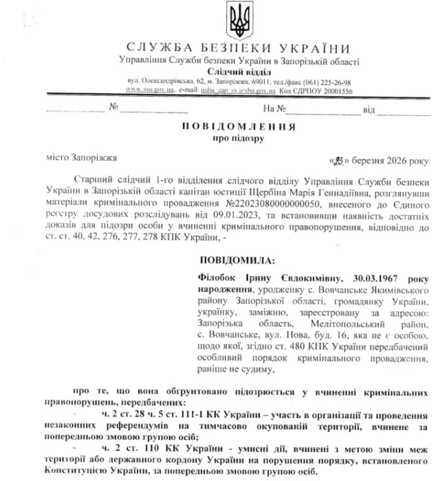 Слідство СБУ підкреслює: Філобок діяла абсолютно добровільно. Жодного примусу чи погроз на її адресу не зафіксовано — лише корисливість і щирі проросійські погляди. Вона свідомо допомагала змінювати кордони України, за що тепер офіційно визнана підозрюваною.