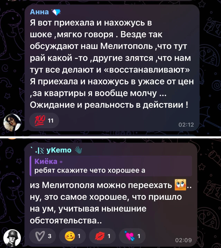 - Я приїхала й, м’яко кажучи, перебуваю в шоці. Усюди так обговорюють наш Мелітополь, ніби тут якийсь рай, інші ж зляться, що нам тут усе роблять і «відновлюють». Я приїхала й була вражена цінами, а про квартири взагалі мовчу… Очікування і реальність у дії!