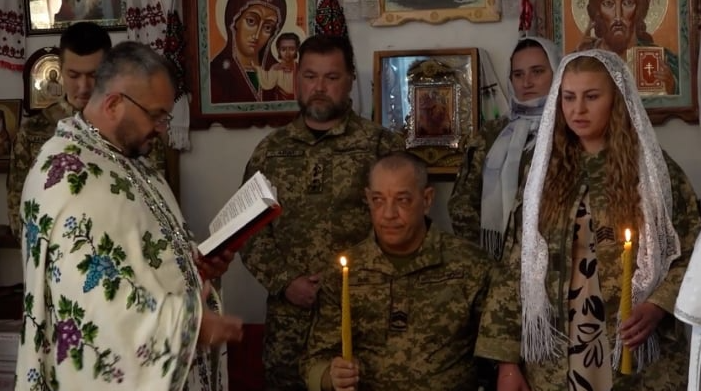 Вінчання Юлії та Олександра у храмі Православної Церкви України. Фото-скрін з телерадіостудії Міністерства оборони України “Бриз”