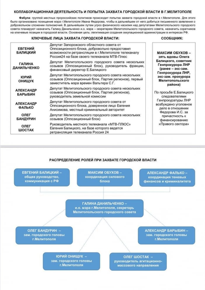 Особливої уваги заслуговують родинні зв’язки Обухова. Він зять депутата Мелітопольської міськради від «Опозиційного блоку» Ольги Русило — вдови Олега Балицького, брата нинішнього гауляйтера Мелітополя Євгена Балицького.