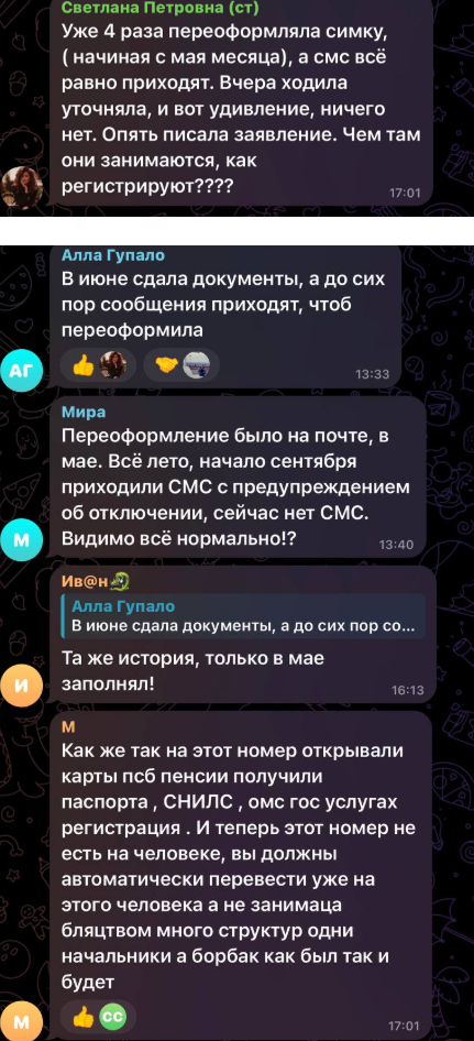 "Вже 4 рази переоформляла СІМ-ку, починаючи з травня. А СМС все одно приходять. Вчора ходила уточнювала. І ось сюрприз - нічого немає. Знову писала заяву. Чим вони там займаються і як реєструють?"
