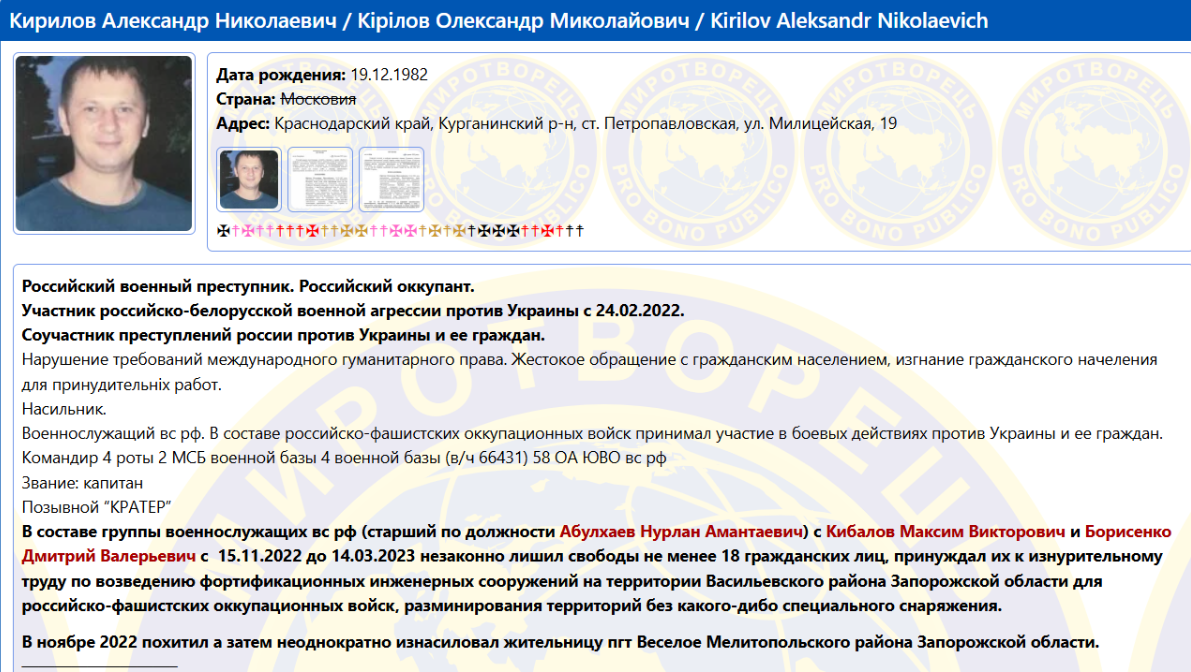 Відомості про окупанта Кірілова. Джерело: "Миротворець"