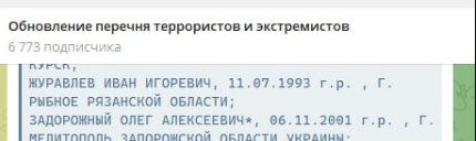 Житель Мелітополя Олег Олексійович Задорожний, народжений 6 листопада 2001 року, опинився у російському «Переліку терористів та екстремістів». Це сталося вже після окупації міста російськими військами.