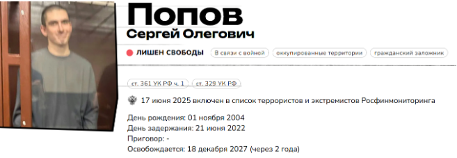 А 28 січня 2025 року Південний окружний військовий суд визнав Сергія Попова винним і засудив його до 5,5 років позбавлення волі. Вирок не було оскаржено і набрало законної сили. На даний момент відомо, що Сергій відбуває своє покарання в ІК 4, що знаходиться в В'язніках, Володимирська область, Росія. На волю Сергій вийде у вересні 2027 року.