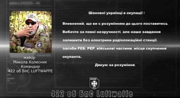 Нічний наліт 23 жовтня провів 422-й окремий батальйон безпілотних систем Luftwaffe. Відео операції опублікував командир батальйону майор Микола Колесник. На записі видно, як БПЛА атакує трансформаторну підстанцію Мелітополя.