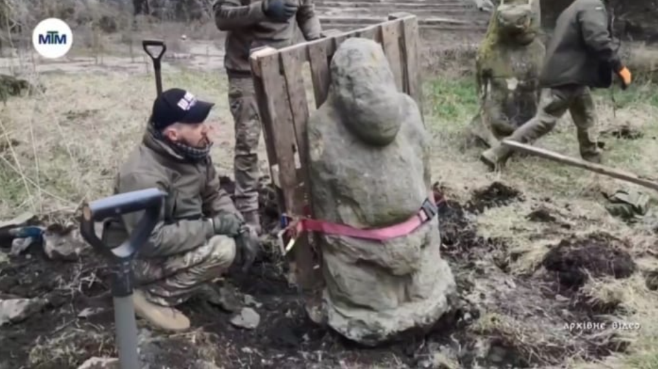 Евакуація кам'яних баб з прифронтових громад Запорізької області. Фото-скрін з телеканалу МТМ