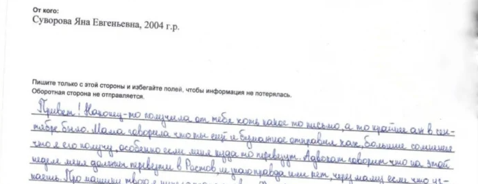 «Яну тримали в одиночці, погано годували, не давали спати, світло горіло постійно. Пізніше її перевели до Маріупольського СІЗО, зараз вона перебуває в СІЗО № 2 Таганрога. Листи проходять сувору цензуру, але вона тримається і пише регулярно», — каже Олександр.