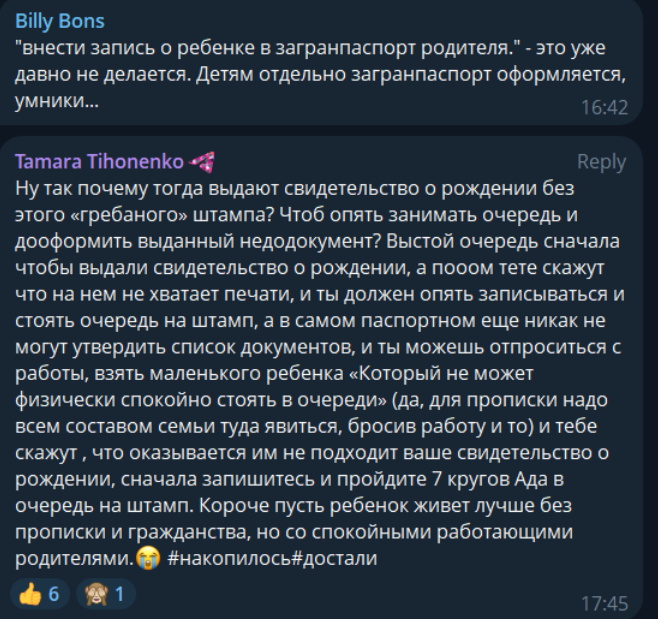 “Ну так чому тоді видають свідоцтво про народження без цього «чортового» штампа? Щоб знову займати чергу і дооформляти виданий недодокумент? Стій спочатку в черзі, щоб видали свідоцтво про народження, а потім тітці скажуть, що на ньому не вистачає печатки, і ти повинен знову записуватися і стояти в черзі на штамп, а в самому паспортному ще ніяк не можуть затвердити список документів, і ти можеш відпроситися з роботи, взяти маленьку дитину, «яка не може фізично спокійно стояти в черзі» (так, для прописки треба всім складом сім'ї туди з'явитися, кинувши роботу і все) і тобі скажуть, що виявляється їм не підходить ваше свідоцтво про народження, спочатку запишіться і пройдіть 7 кіл пекла в чергу на штамп. Коротше, нехай дитина живе краще без прописки і громадянства, але зі спокійними працюючими батьками”.