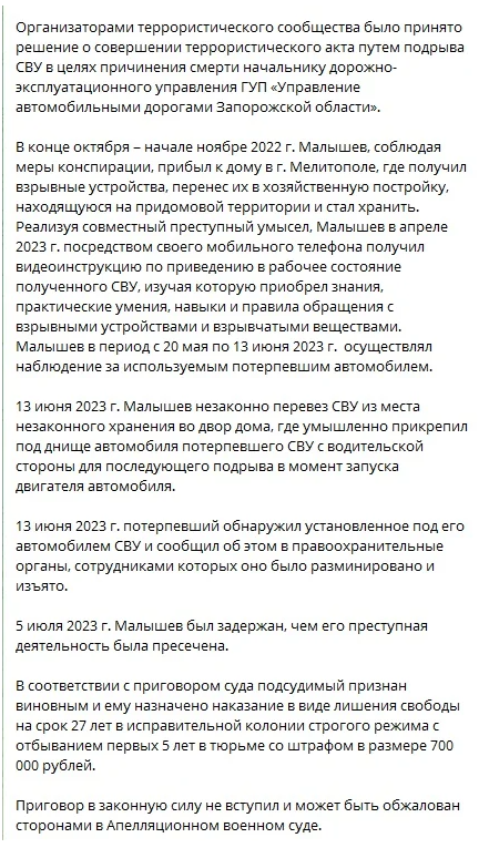 Окупанти зліпили справу одразу за п’ятьма тяжкими статтями КК РФ, зокрема «участь у терористичному співтоваристві» та «замах на теракт». За версією слідства, Артем нібито за завданням ГУР МО України стежив за керівником ГУП «Управління автомобільних доріг Запорізької області» (ймовірно, колаборантом Іваном Мироновим) і навіть заклав вибухівку під його автомобіль.