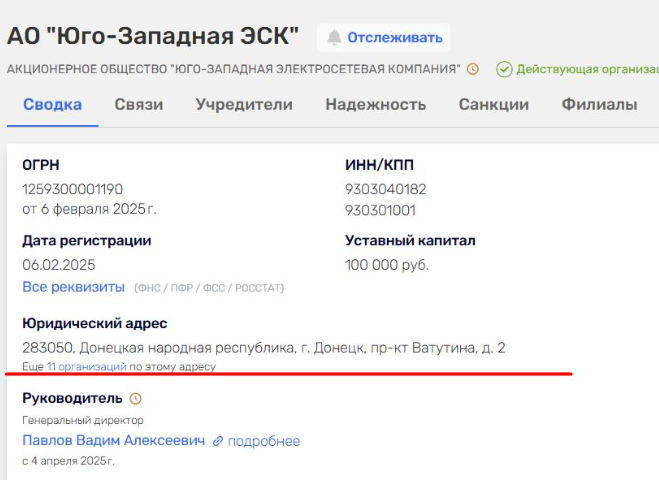 У Розпорядженням Уряду РФ від 16 квітня 2025 року № 925-р акціонерне товариство «Південно-Західна електромережна компанія» визначено як системоутворюючу територіальну мережеву організацію на ТОТ Запорізької області, а також на Херсонщині, у Луганській та Донецькій областях. Такий собі монополіст з обслуговування енергетичних мереж на окупованих територіях чотирьох областей України.