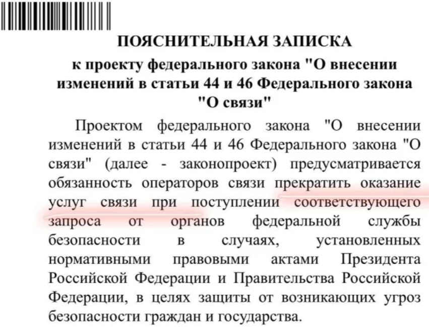 Мобільних операторів зобов'яжуть негайно відключати мобільний зв'язок та інтернет на запит ФСБ — без пояснення причин і без будь-якої відповідальності перед абонентами. Відповідні поправки до закону «Про зв'язок» вже схвалені урядовою комісією і можуть бути розглянуті Держдумою найближчим часом. Після їх прийняття ФСБ отримає право в будь-який момент вимагати зупинки будь-яких послуг зв'язку — нібито «з метою безпеки держави».