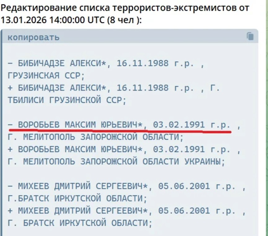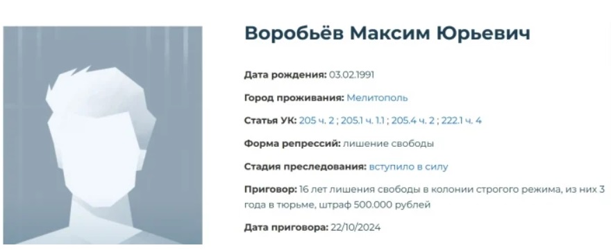 Серед внесених до списку — мелітополець Максим Воробйов, раніше засуджений окупаційним судом до 16 років позбавлення волі.