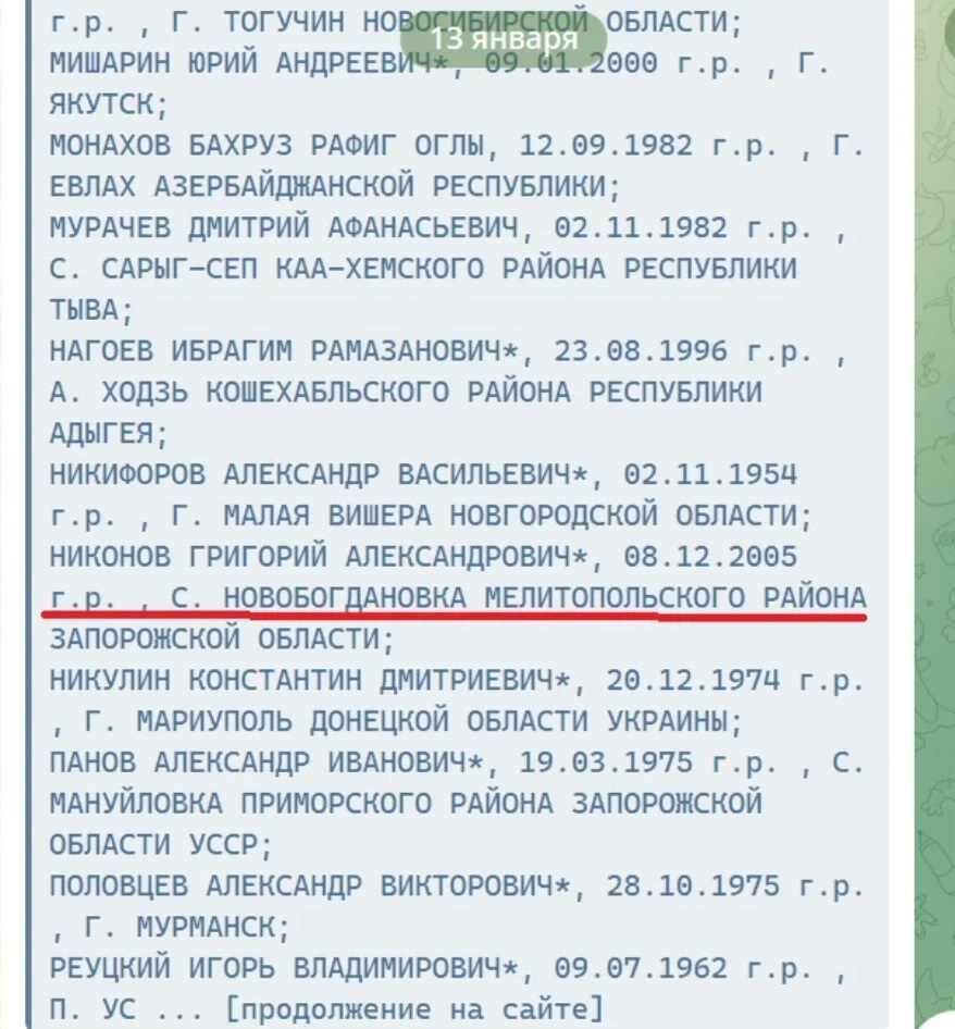 Третім уродженцем регіону, внесеним до списку, став Григорій Ніконов, 2005 року народження, із села Новобогданівка Мелітопольського району. Про нього у відкритих джерелах немає інформації.