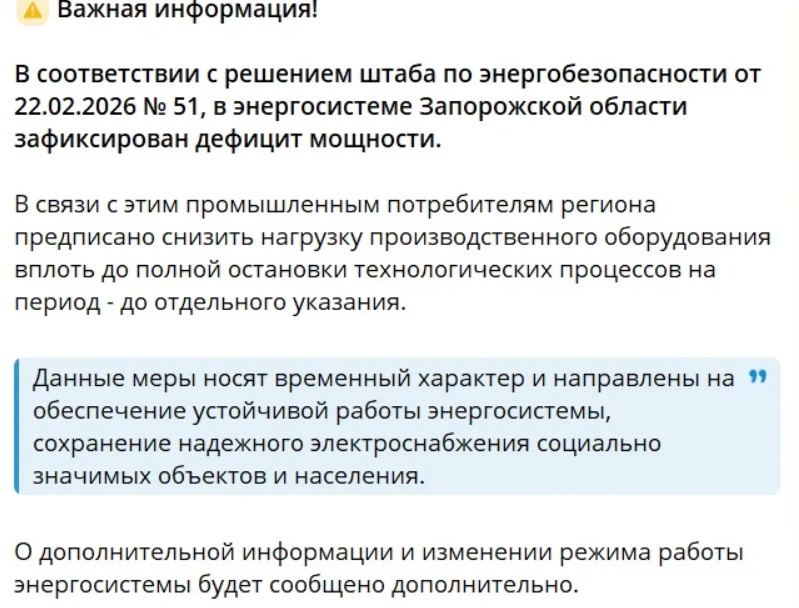 Окупанти заявили про «дефіцит потужності» в енергосистемі регіону та, посилаючись на рішення штабу з енергобезпеки від 22 лютого 2026 року №51, наказали промисловим підприємствам знизити навантаження аж до повної зупинки виробничих процесів «до окремої вказівки».
