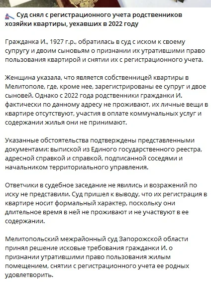 Так званий Мелітопольський міжрайонний суд Запорізької області задовольнив позов і постановив визнати родичів жінки такими, що втратили право користування житловим приміщенням, та зняти їх із реєстраційного обліку.