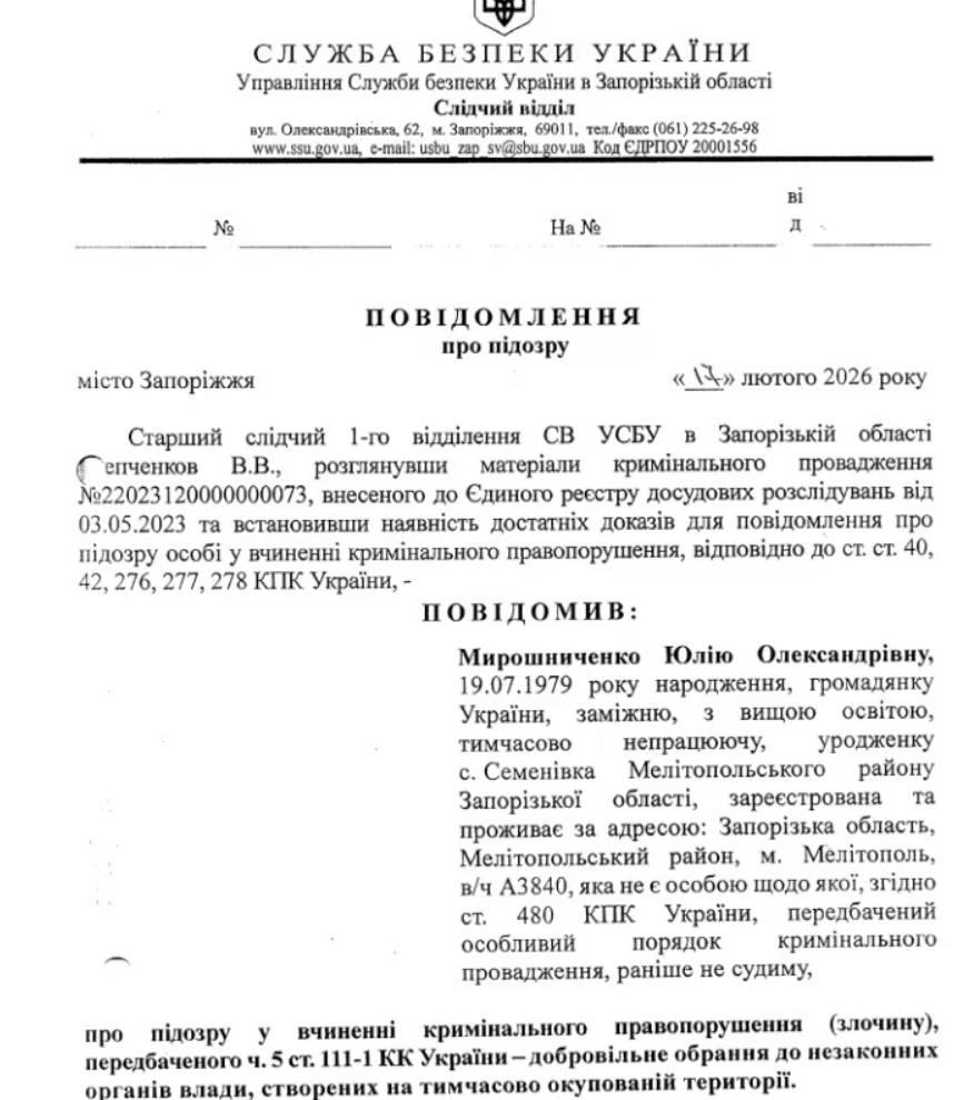 У правоохоронній системі України завершено важливий етап розслідування щодо однієї з помітних фігур окупаційної адміністрації Мелітополя. Служба безпеки України офіційно повідомила про підозру, завершила досудове розслідування та готує до передачі в суд матеріали кримінального провадження проти Юлії Олександрівни Мирошниченко.