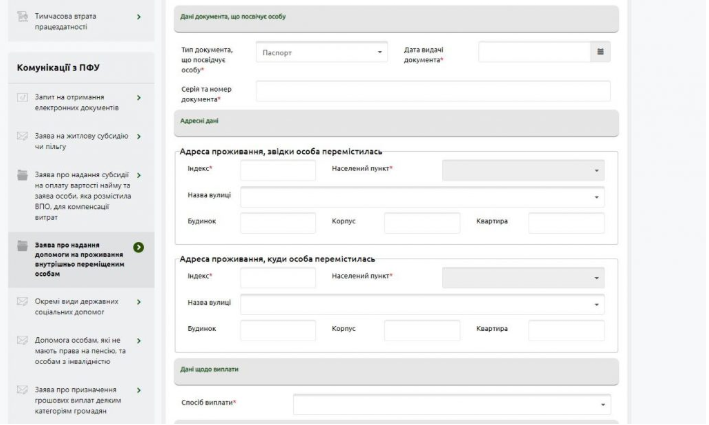 У особистому кабінеті знайдіть меню ліворуч. У розділі «Комунікації з ПФУ» виберіть пункт «Заява про надання допомоги на проживання ВПО».