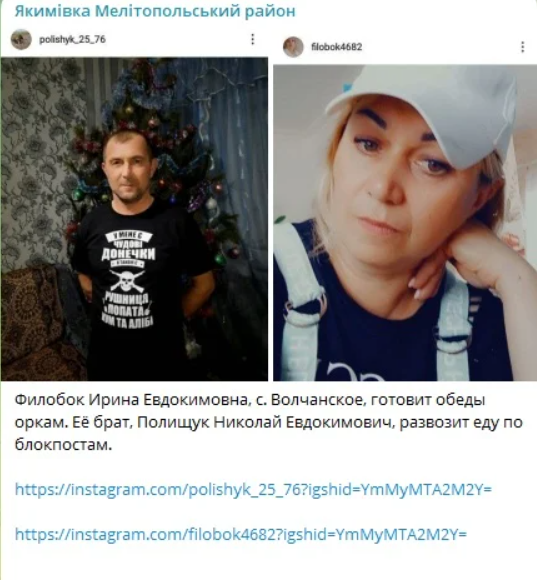Місцеві жителі повідомляли, що Філобок активно готувала гарячі обіди для окупантів, а її брат, Микола Поліщук, взяв на себе логістику — розвозив їжу по блокпостах. Цей «сімейний підряд» із годування загарбників не залишився непоміченим.